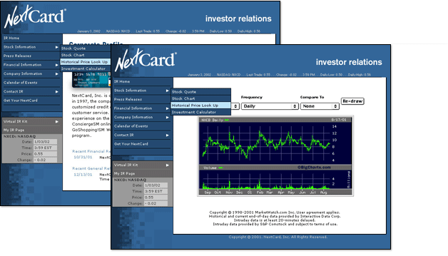 Project: Investor Relations Site re-designRedesigned to follow the new branding scheme I developed for the Nextcard properties, Nextcard's IR site had to accomodate a partner's chart generation software